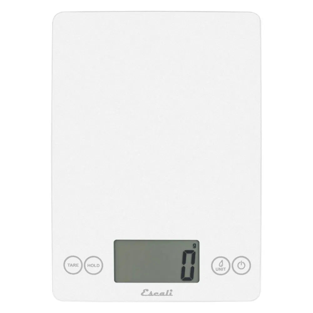 Add a splash of color to your kitchen with the Escali ARTI Glass Digital Kitchen Scale in Frost White. The scale has a weighing capacity ranging from 0.1 ounces (1 gram) all the way to 15 pounds. The smooth glass surface allows for easy cleanup. The large display is 50% larger than most kitchen scales and is crisp and clear for easy reading.